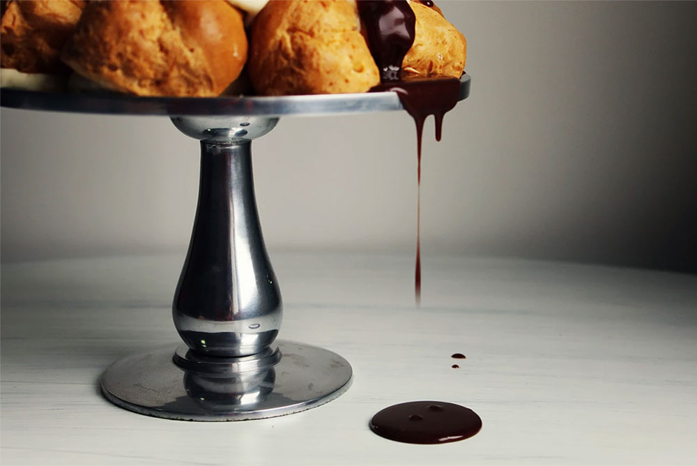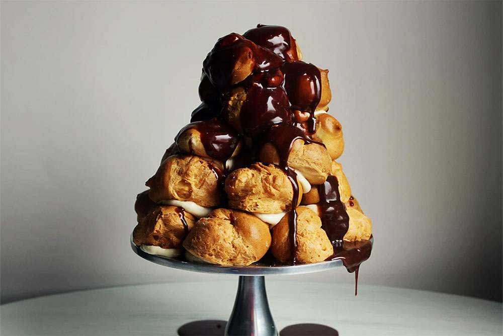 - δημιουργούμε έναν πύργο (όπως στις φωτογραφίες) με τα "σου" που φτιάξαμε και ακριβώς πριν σερβίρουμε, περιχύνουμε με τη σάλτσα πραλίνας
